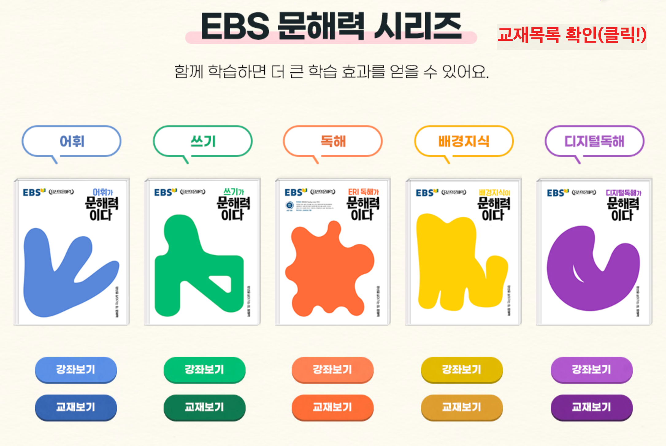 어휘, 쓰기, 독해, 배경지식, 디지털독해 총 5가지의 영역으로 나누어 문제집을 발간하여